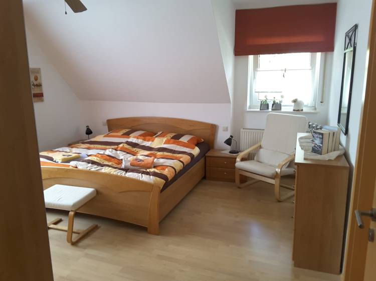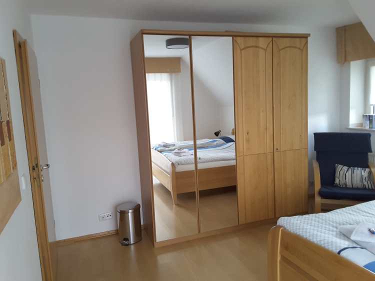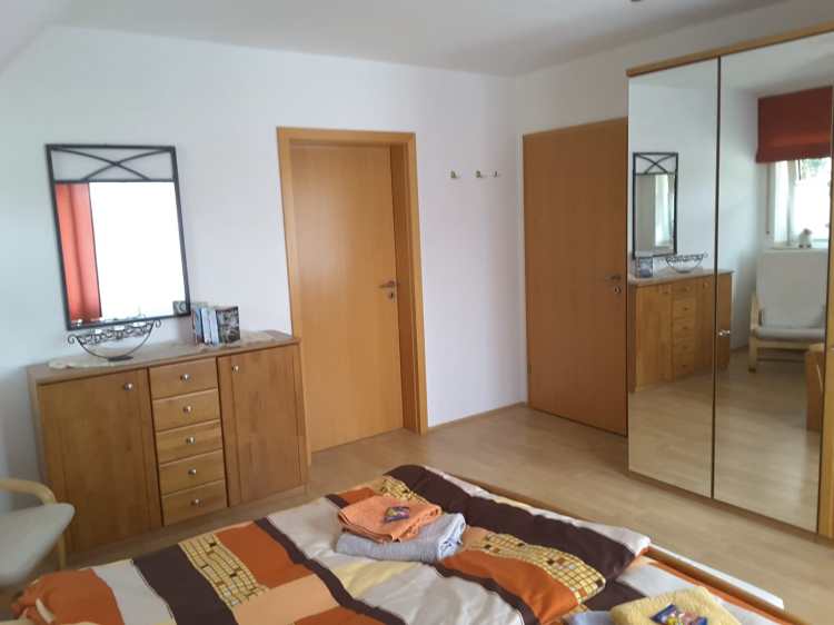 Ein Schlafzimmer mit Doppelbett, Kleiderschrank, Bettwäsche inklusive.