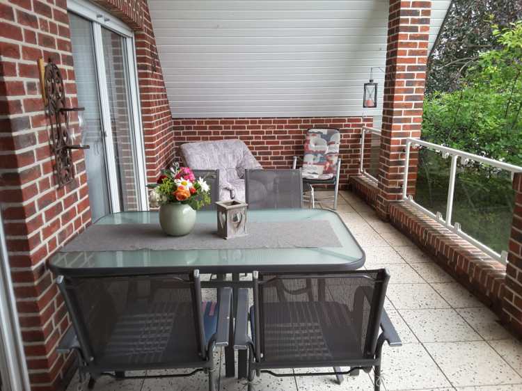 Der möblierte und überdachte Balkon (Südseite, 24 m²) ist vom Wohnzimmer aus zu erreichen.